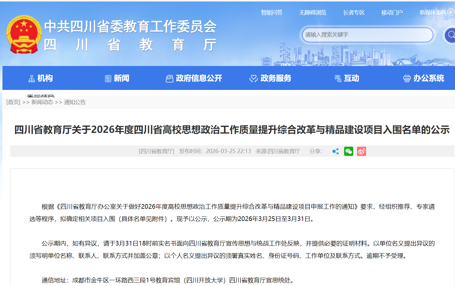近日,四川省教育厅公布2026年度高校思想政治工作质量提升综合改革与精品建设项目立项名单,我校3个项目...【详情】03
