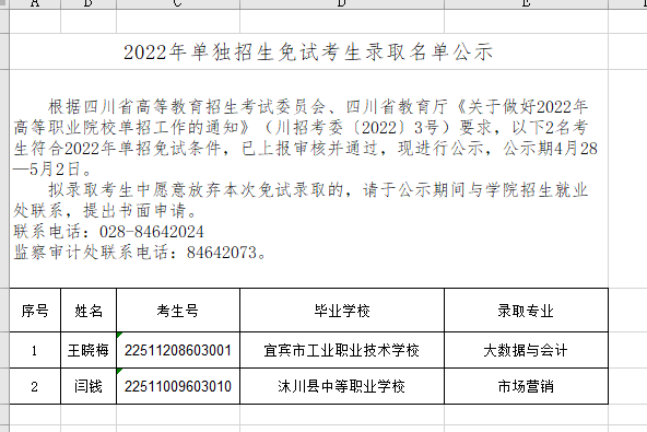 2022年单招免试生录取公示