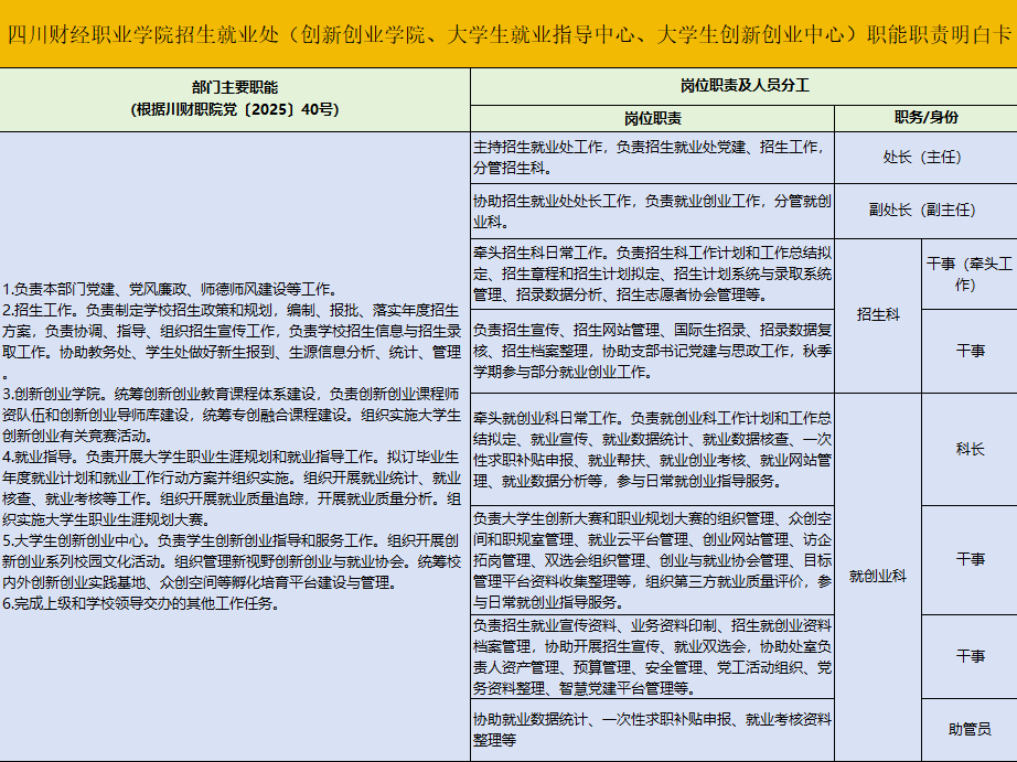 负责开展大学生职业生涯规划和就业指导工作。拟订毕业生年度就业计划和就业工作行动方案并组织实施。组织开展就业统计、就业核查、就业考核等工作。组织开展就业质量追踪,开展就业质量分析。组织实施大学生职业生涯规划大赛。