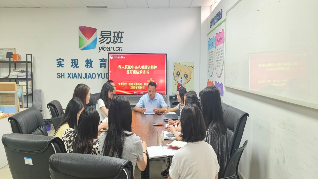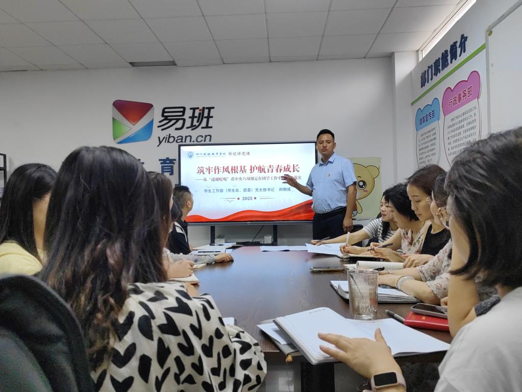 为深入贯彻落实中央八项规定精神,强化团学工作纪律建设,6月6日上午,学生工作部(学生处、团委)党支部于易班办公室开展“筑牢作风根基 护航青春成长”主题党课。活动由党支部书记田刚成主持,支部全体党员教师积极参与,共筑廉洁团学工作防线。