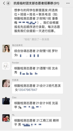根据成都市及学院疫情防控要求,川财留校学子勇于担当,逆风而行的防疫志愿者积极投身抗疫当中,重点开展核酸检测人员引导、信息检录、物资派发和维持秩序等工作,“临时团支部”累计志愿服务时长约1000小时,协助学院为留校老师、学生及工作人员完成每日核酸检测,为川财疫情防控贡献青春力量。