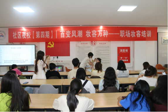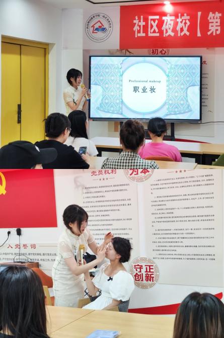 2023年5月19日下午18:30,社区夜校第四期“职业妆容培训”课程在社区活动中心举行,美妆达人李嘉琪,为小白菜们带来了一堂职场美妆课。