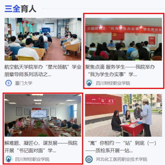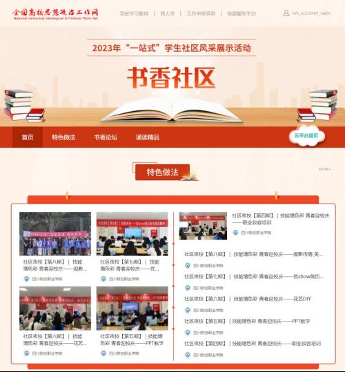 活动要求按照“社区讲堂、书香社区、社区团队、工作案例”等4个版块分类展示高校“一站式”学生社区建设风采。6月18日,全国高校思想政治工作网多板块、大篇幅报道了我院在2023年上半年所开展的社区活动。在“特色做法”板块更是整版报道了我院社区夜校系列课程活动。