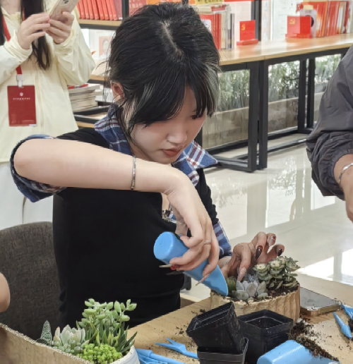 活动现场,气氛热烈非凡。工作人员提前准备了各式各样的多肉植物,以及小铲子、营养土、精美花盆等种植工具。在专业指导人员的细致讲解下,参与活动的同学们了解了多肉植物的生长习性、种植要点和养护技巧。随后,大家迫不及待地动手实践,填土、栽种、铺面,每一个步骤都做得认真专注。经过一番精心劳作,一盆盆独具匠心的多肉盆栽在同学们的巧手下诞生。