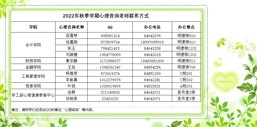 2022年秋季学期心理咨询老师联系方式