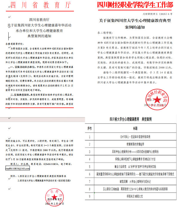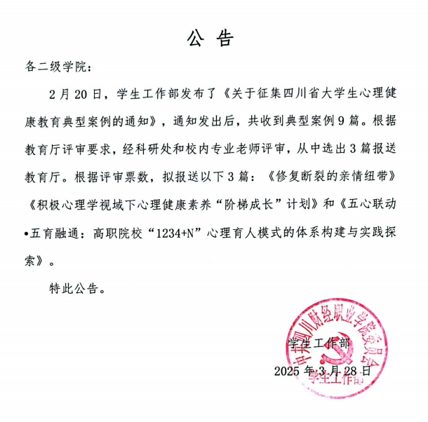 接教育厅文件精神,为贯彻落实全国、全省教育大会精神和《四川省全面加强和改进新时代学生心理健康工作实施方案》有关要求,学生工作部在校内征集大学生心理健康教育典型案例,发布了《关于征集四川省大学生心理健康教育典型案例的通知》。