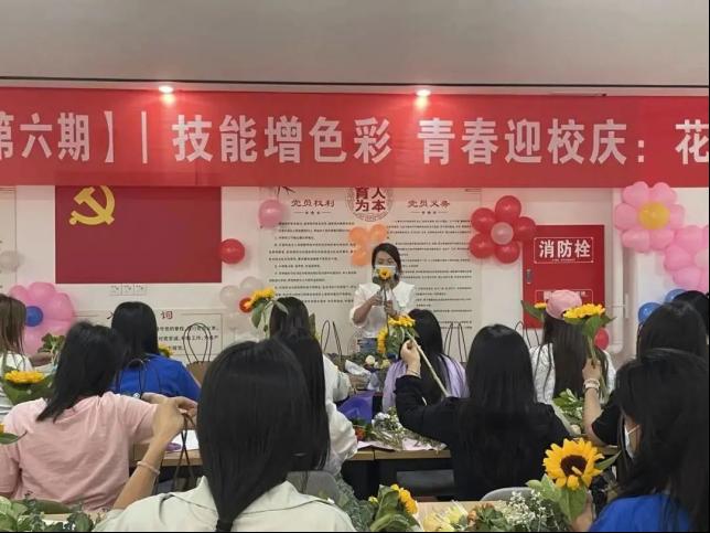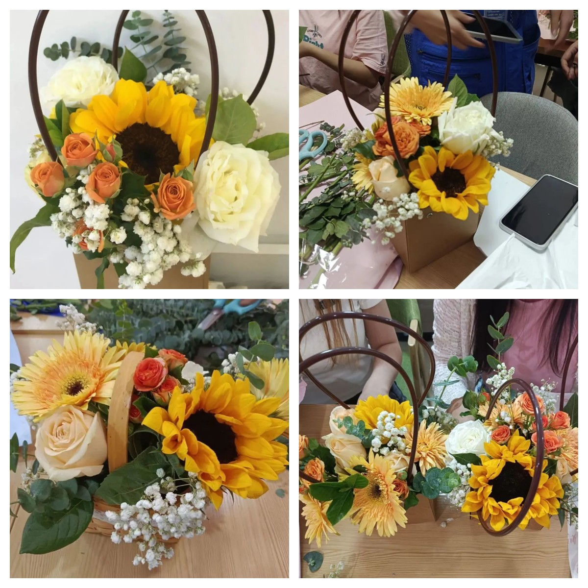 活动现场,蒲江梅老师介绍了现场的各类花束,认真讲解了花的外形特征、颜色、搭配等基础知识后,便带领同学们开始学习插花。