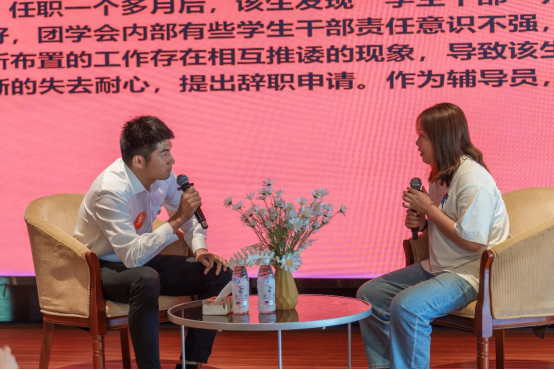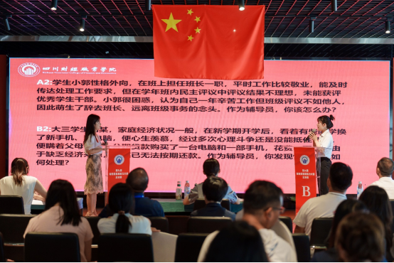 在案例研讨环节,参赛选手两人一组,以“我提问、你回答”的方式开展。参赛辅导员结合案例中呈现的各类问题,深入把握学生动态,从思想价值引领、班团组织建设、心理危机应对与处理、网络意识形态等方面,由浅入深共同辨析原因、研讨对策、总结规律。展示了我校辅导员扎实的理论水平和良好的职业素养。