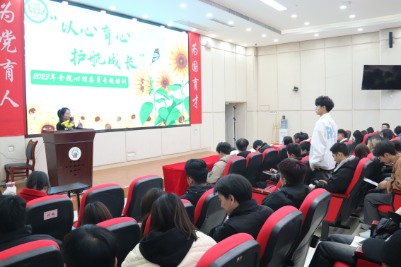 最后,学生工作部孙晓英老师做培训总结,并提出希望和要求,希望通过此次培训,大家能够收获满满的心理能量,为未来的学习和工作增添动力,助人助己,以心育心,护航成长。前来参训的同学表示,此次培训让他们受益匪浅,明确了工作方向,提供了方法指导和支持,他们将会用积极的态度帮助同学,用心、用情继续做好心理健康工作。