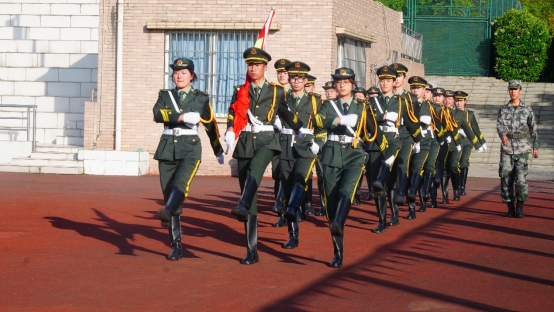 清晨七点五十分,升国旗仪式正式开始。国旗护卫队的同学们迈着整齐划一、铿锵有力的步伐,从操场入口出发,护送着五星红旗正步走向旗杆,全体师生面向国旗肃立致敬。随着《国歌》的响起,全体师生向冉冉升起的五星红旗致以崇高的注目礼,在耀阳的晨光中五星红旗迎风飘扬。