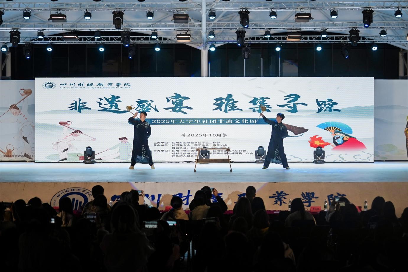 仪式现场,非遗展演融合传统底蕴与青春气息,精彩轮番上演。四川巾帼非遗传习中心带来的变脸喷火表演率先点燃氛围,五彩脸谱瞬息变换、烈焰腾空而起,将川剧艺术的奇幻魅力展现得淋漓尽致;古琴曲《流水》泠泠奏响,丝弦间流淌千年诗意,带领观众触摸古人的精神世界;《龙行十八式长嘴铜壶》茶艺表演更显惊艳,传承人手持长嘴铜壶,招式行云流水,完美融合茶之韵、力之美与艺之精。