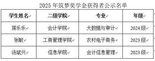 根据《关于做好2025年筑梦奖学金评审工作的通知》(川财职院学工〔202599 号),经学生本人申请,二级学院审核推荐,学生资助管理中心组织复核评审,我校2025年筑梦奖学金拟推荐候选人共3名学生。名单予以公示,公示期为114日——1110日,如有异议,请联系学生资助管理中心(学工部204办公室)。