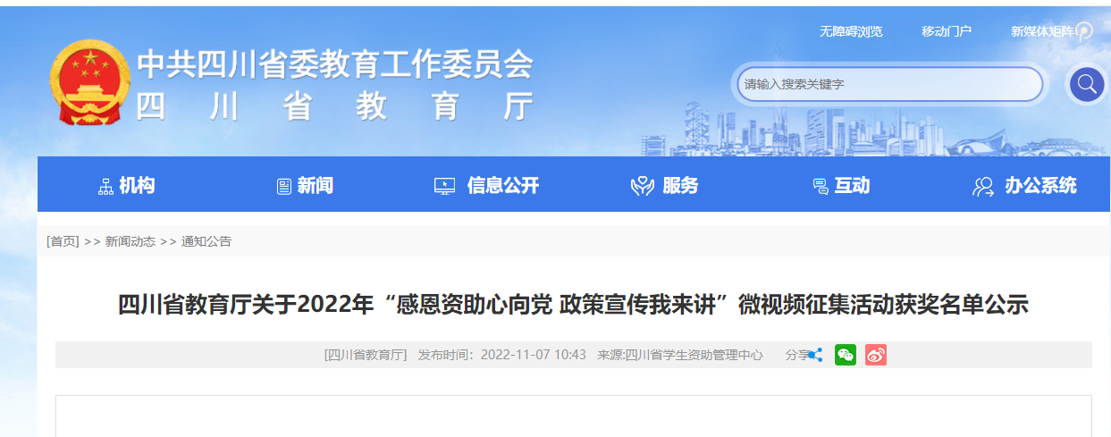由四川省教育厅组织开展“感恩资助心向党,政策宣传我来讲”微视频征集活动,近日,经教育厅组织专家评审,教育厅公示获奖名单,全省高校共有132件作品获奖,其中我校会计学院的微视频《服义务兵役国家教育资助—听我说》荣获优秀奖,学工部大学生资助管理中心的微视频《感恩资助心向党 政策宣传我来讲》荣获二等奖,学院荣获作品征集活动优秀组织奖。