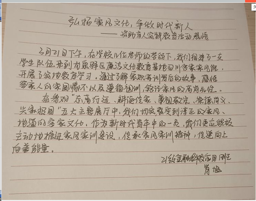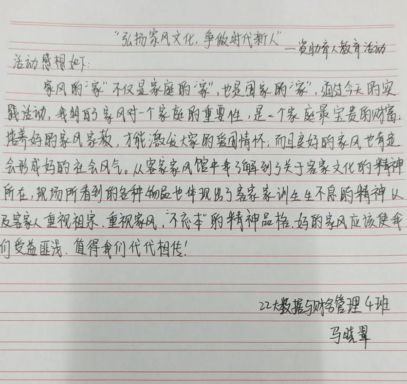 “家风正则民风淳,家风正则政风清,家风正则党风端。”同学们通过家风馆的图片、展板、实物、影像等形式,深切感受到客家人的家国情怀,陈列的家训家规彰显四川客家人清白做人、清廉为官、诚信营商的优良家风,让家风传统犹如春风细雨,浸润于青年学子的教育中,以家风建设助力作风涵养,以家庭和睦促进社会和谐,努力形成纯正家风与优秀作风的良性互动格局。