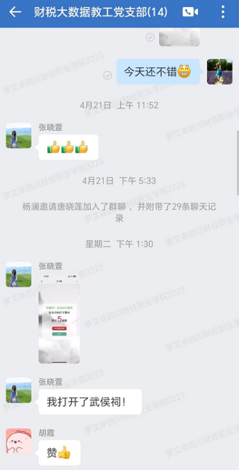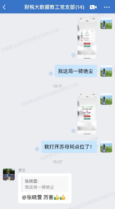 为深入贯彻落实党中央关于党纪学习的相关活动要求,财税大数据应用教工党支部在党总支的带领下,积极开展党纪学习教育,丰富学习形式,提升学习实效。具体举措有,积极发动支部党员参与由省纪委主办的《中国共产党纪律处分条例》网络知识竞赛。活动开展以来,支部党员同志们每天认真学习,踊跃打卡,分享心得,形成了比学赶超、你追我赶的浓厚学习氛围。通过此次活动不仅加深了党员们对《条例》的理解和认识,也进一步增强了大家的纪律意识和规矩意识,为营造遵纪守规、崇廉尚洁的作风打下来坚实基础。