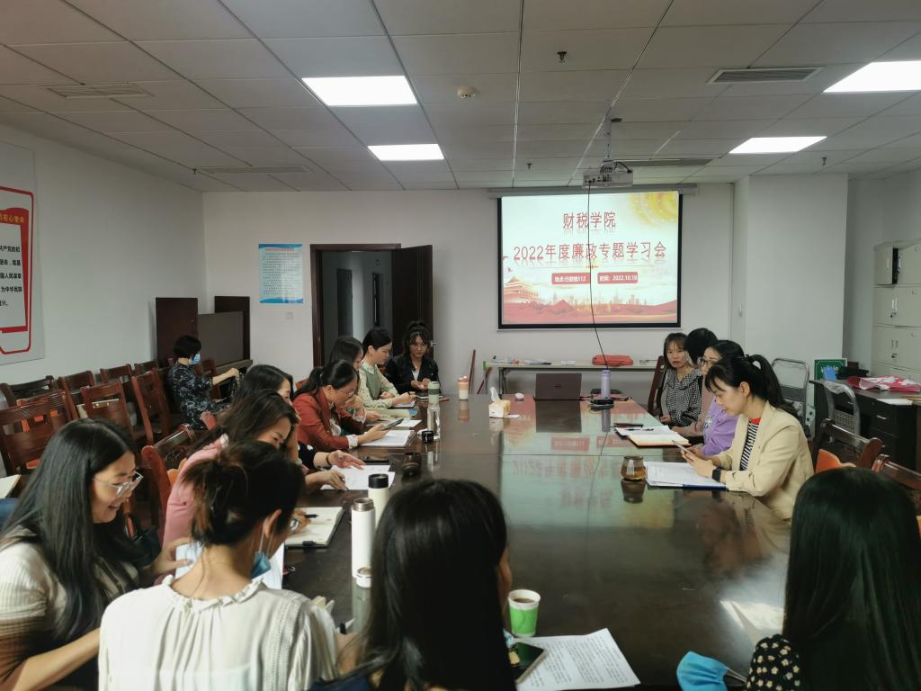 根据驻财政厅纪检监察组、财政厅机关纪委要求,为贯彻落实全面从严治党和党风廉政建设要求,持续加强廉政教育。2022年10月18日,财税学院于行政楼512会议室开展三季度党员干部廉政教育专题学习活动,财税学院党总支副书记陈露同志主持,全体教师参加。