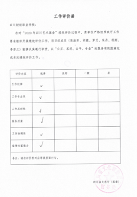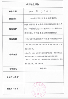 双喜临门,辉煌灿烂。本次天府旅游名县的项目成功并非是一次偶然,同年,绩效评价管理中心另一个项目也成功验收,7月,中心向四川省剧目工作室报送的《2020年度四川艺术基金绩效评价报告》也顺利通过验收,验收评价函依旧是一致的好评。
