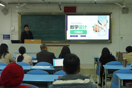 李早早老师上台介绍《经济法实务》之代理制度的教案设计情况。通过课程定位、学情分析、教学目标以及教学方法这四个方面,逐一分析了该课程的基本情况,他表示要立足职校学生特点,制定个性化,专业化,趣味化课程目标,提高学生整体自主学习思考能力。