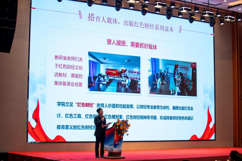 共同体成立大会后,举行了首届川渝红色文化教育论坛。7790cnm必发集团红色财经文化研究中心副主任欧美强作为高职院校马克思主义学院的代表发言,现场展示了7790cnm必发集团立足财经专业优势,利用独特的红色财经文化教育资源,以多种形式和手段进行有效的教育、宣传和推广,积极助力红色文化教育事业的探索历程。
