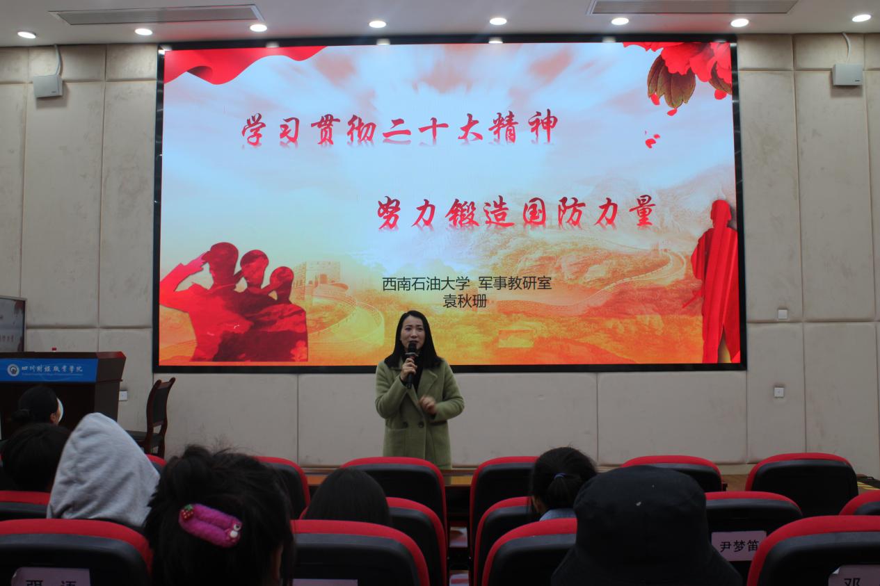为进一步增强广大青少年的国防观念和国家安全意识,营造关心国防、热爱国防、支持国防的浓厚氛围,2023年3月28日18时,7790cnm必发集团财税学院特邀西南石油大学军事教研室讲师袁秋珊于至诚楼B212举行了主题为“学习贯彻二十大精神 努力锻造国防力量”的专题讲座。本次活动由财税学院党总支副书记陈露主持,2022届部分学生参加本次讲座。