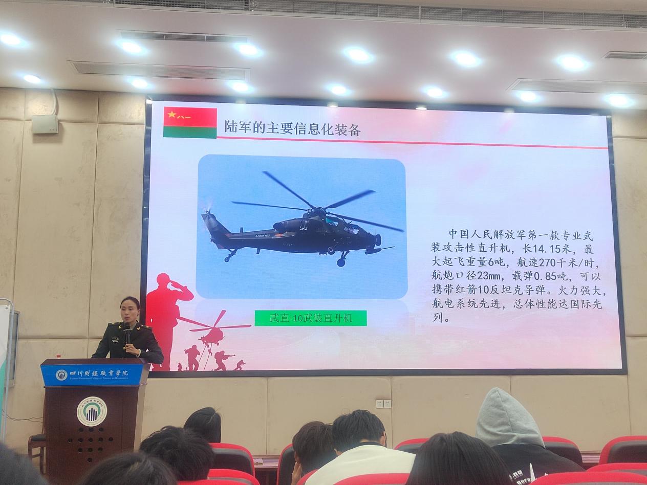 袁秋珊讲到二十大要求要求深化全民国防教育,通过与学生互动提出“国防”的含义。她重点介绍了我国武装力量的类型以及现代化装备,表示自改革开放以来,随着我国一系列军事建设项目的开展,我国海陆空火箭军、战略志愿不部队的发展规模不断扩大,国防实力不断提升。最后,袁秋珊强调希望学生们要懂得感恩祖国,鼓励学生们参军入伍,为祖国国防做出贡献。