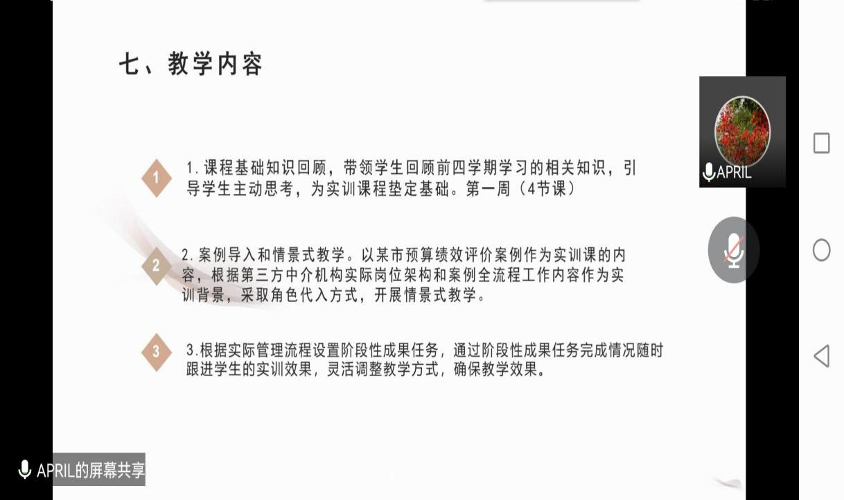 高淑芳老师采用腾讯会议的方式开展试讲。高老师是预算绩效评价的专家,学识渊博,稳重儒雅,有丰富的实践经验,采用案例导入和情景式教学的方式授课,将理论知识变得生动有趣。
