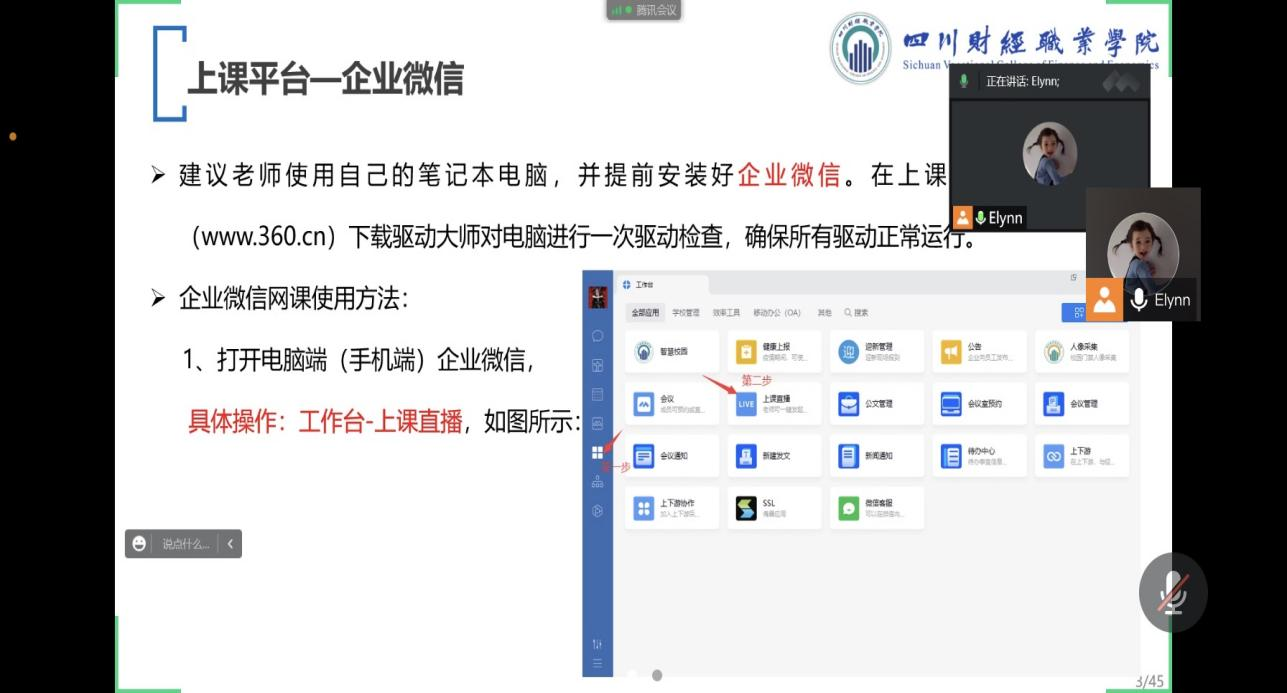 培训会上,唐旖旎老师讲解了智慧川财、企业微信、腾讯会议、超星平台的使用,并针对线上授课过程中学生考勤、课堂互动、作业布置等环节进行了详细说明。卢颖和段鑫艺两位老师就线上授课中会遇到的问题与唐旖旎老师进行了探讨和经验交流。