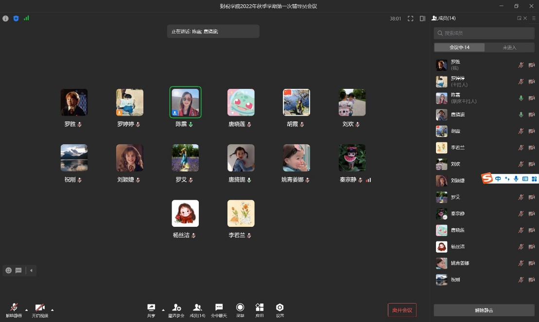 为落实疫情防控需要,确保财税学院2022年秋季各项教学工作平稳、有序开展,2022年8月30日晚7点,我院通过腾讯会议召线上教学工作研讨会,会议由财税学院副院长罗艾主持,院长祝刚、各教研室主任杨澜、朱丹、胡霞、戴娜娜、组织员唐旖旎及教学干事杨丝洁参加。