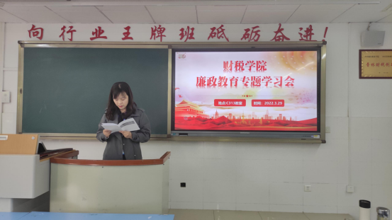 为贯彻落实全面从严治党和党风廉政建设要求,持续加强廉政教育,根据《关于召开2022年一季度财政厅党员干部廉政教育专题会的通知》要求,2022年3月29日,财税学院于教学楼C313开展一季度党员干部廉政教学专题学习活动,财税学院院长祝刚同志主持,全体教师参加。
