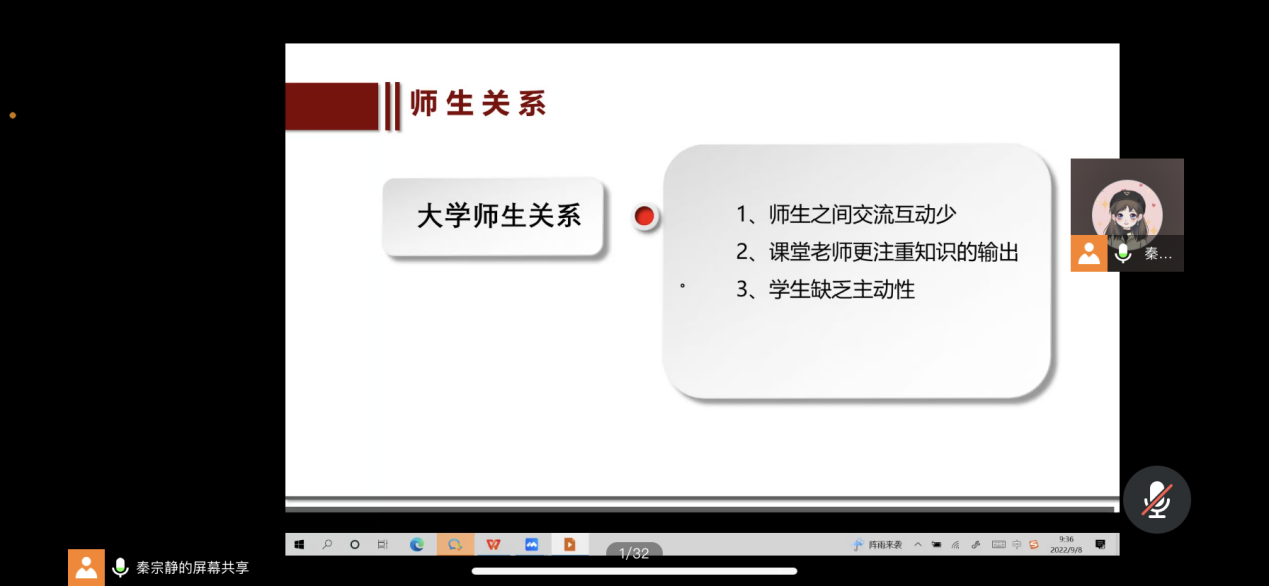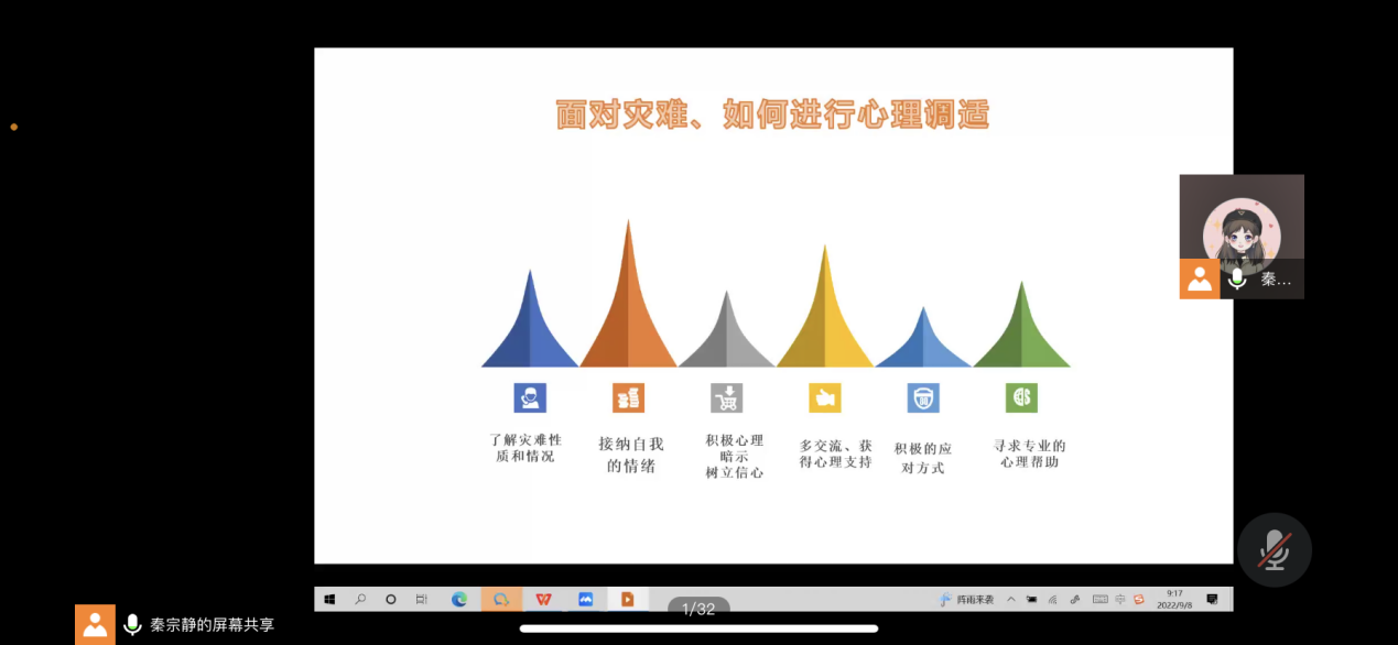 心理教育“早理秽”,陪伴成长有“引力”。为陪伴大学生心理健康成长,引导大学生积极向上生活,2022年9月8日,“同心晓屋”心理工作室负责人秦宗静开展2022级新生心理健康讲座,帮助实现大学生心理问题早预防、早消除。秦老师围绕疫情期间的心理调适、人际交往、亲密关系等方面介绍了大学生常见的心理困扰、心理异常的识别方法,并向同学们传授了培养积极乐观的心态,维护心理健康的小妙招。最后,秦宗静介绍了学校心理健康中心,鼓励同学们遇到心理困扰及时寻求帮助。