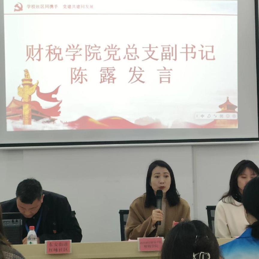 陈露代表财税学院为本次活动致辞。首先,陈露对红咏社区给予这次合作结对机会表示感谢,并表示学院将做好对结工作。接下来,陈露对本次结对活动安排进行了大概介绍,阐述了此次活动的重要意义。她介绍到:财税学院总共有党员25人,三支党支部,并着重介绍了财税学院以前所做过的“与爱同行志愿服务”十分出彩。