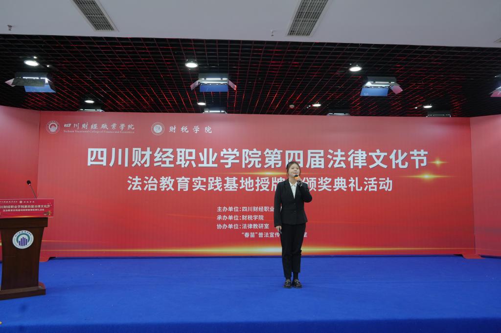 随后,陈露上台致辞,她首先对本次闭幕式的参加人员表示热烈地欢迎和由衷地感谢。陈露表示,四年法律文化节的举行已经成为财税学院的一项特色文化品牌,它对于增强师生法治意识、弘扬校园法治文化具有积极作用。同时,也表达了对同学们积极参与法律文化节的期望,希望财税学子能够从中有所收获,感受到法律的魅力,并将法治理想与法律追求转化为具体的实践与行动。