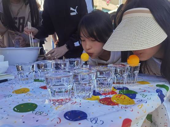 活动第二项为“吹散烦恼”(吹乒乓球),此活动玩法为:主持人准备八个等高的杯子,每个杯子装满水,每四个杯子竖排成一排,每一排的第一个杯子放上乒乓球,2名参赛者将乒乓球从第一个杯子吹向另一个杯子,吹至最后一个杯子即为过关,若乒乓球吹落不得分。此活动中同学们在吹乒乓球时认真专注的表情和完成活动开心的笑颜似乎是在吹乒乓球时也吹散了自己的烦恼。