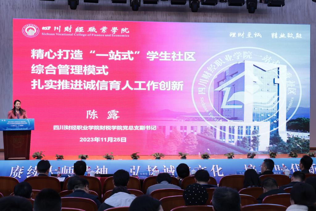 会上,陈露以《精心打造“一站式”学生社区综合管理模式扎实推进诚信育人工作创新》为题,发表主题演讲,报告了我院遵循教育部等八部门《关于加快构建高校思想政治工作体系的意见》,以一站式社区为载体,创新开展诚信文化育人教育的活动经验和成效,对建立“中心+工作站”双向覆盖、培养过程相互衔接的党建协同工作模式进行了详细阐述。陈露分享,“一站式”学生社区与诚信育人深度融合是思想政治教育工作与时俱进、不断创新的必由之路;“一站式”学生社区与诚信育人深度融合是实现多维共育、多元融通,有效践行“立德树人”育人根本的重要举措;“一站式”学生社区与诚信育人深度融合是夯实诚信教育思想根基、优化诚信教育阵地的有效手段。