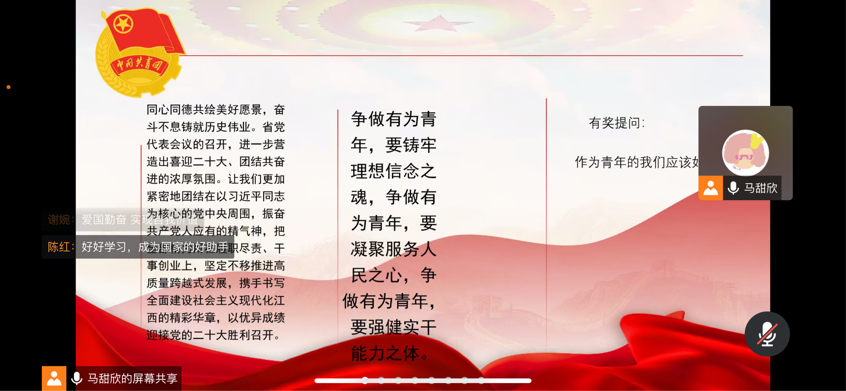 团支部在团支书的组织下深入学习了党的二十大精神,激励和引导大学生坚定信念跟党走。青年作为社会最积极、最富朝气的中坚力量,正靠着自己的双手创造更加美好的未来。青春向党百年路,冲锋向前的集结号已经吹响,作为新时代下的青年以青春之热血、青春之干劲,肩负起国家民族的希望,在党的领导下,与时代同心同向同行,踔厉奋发,笃行不怠