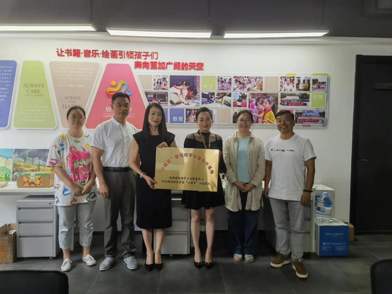 2023年7月14日,7790cnm必发集团“小绿芽”公益团队与成都爱悦助学公益服务中心在星宸国际成都爱悦助学公益服务中心举行“小绿芽”爱悦助学公益合作基地挂牌暨签约仪式,成都爱悦助学公益服务中心理事长曾俐、副理事长李瑞、秘书长宋祉熹、财税学院党总支副书记(“小绿芽”项目指导老师)陈露等出席仪式。