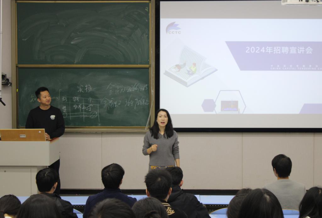 2024年11月12日,中金招标有限公司在至诚楼B108开展了“中金招标面向财税学院2025届毕业生定向招聘”的宣讲会。中金招标袁总和有关负责人,财税学院党总支书记陈露出席宣讲会。本次宣讲会共吸引近200位怀揣梦想的财税学院大三学生参与。