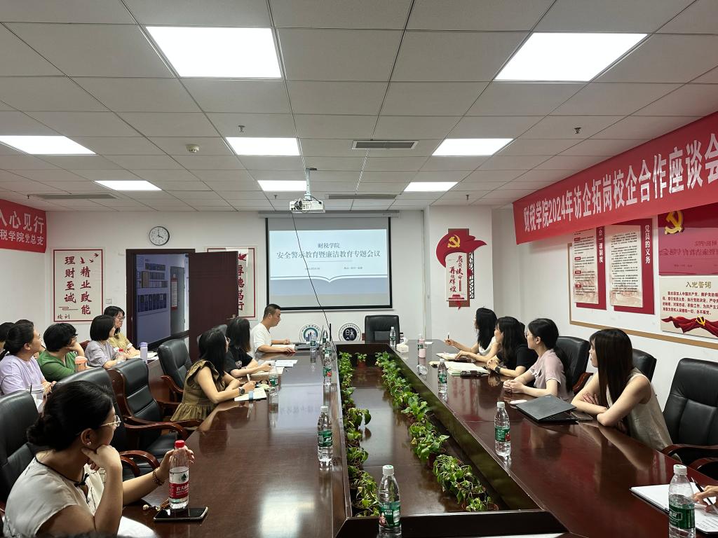 为传达学院安全工作会议精神,落实对全院师生安全警示教育精神,并提高师生廉洁自律意识,2024年6月18日下午,财税学院在行政楼512会议室举行安全警示教育暨廉洁教育专题会议。会议由财税学院党总支书记陈露主持并总结,财税学院办公室主任罗胜做安全专题汇报。