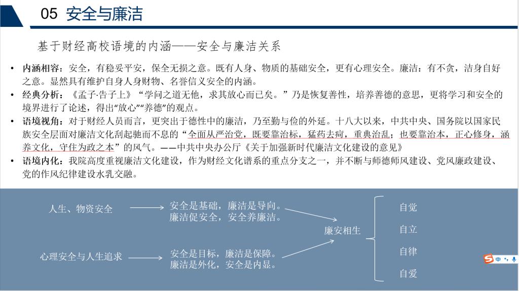 本次专题会以师生场景为指引,设计了“教室、办公室安全”“寝室与公寓(含教师公寓)安全”“国资、信息(舆论)安全”“期末、暑假安全”“安全与廉洁”五个模块化场景,逐一进行了分析,聚焦到各场景重点安全隐患和廉洁风险点,科学论述了“廉安相生”的财经高校语境下的学术观点。会议对当前学校出现的安全隐患进行了较为详细地讲解,对即将开始的期末和暑期安全工作防范指明了方向、表明了态度,为教职工廉洁从教、清廉为人,涵养“自觉、自立、自律、自爱”德性做了分析。会议要求教职工做好相关安全隐患排查工作,思考廉洁内涵,进一步向学生传达安全与廉洁会议精神,落实会议要求,营造安全廉洁学院氛围。