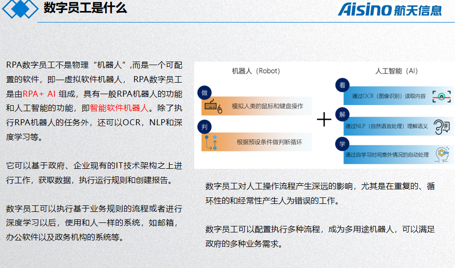 通过数字员工(K-RPA机器人)自动化模拟税务人员,减少办事人员的工作量,提升工作效率。通过AI 政务助手推进各级政府治理体系和服务能力的智能化提升,依托人工智能、云计算、大数据、流程发掘等领先技术,打造“智慧政务”、“智慧审批”和“政务工作平台”一体化平台,助力政府深化“放管服”改革,实现现有流程优化和改革,让办事群众随时随地处理办事需求。