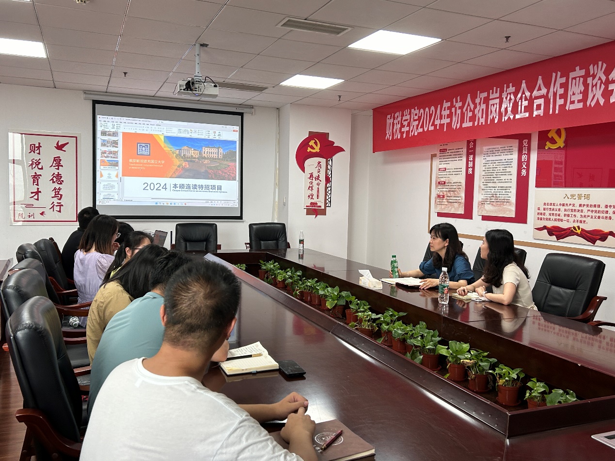 为进一步开拓我院师生国际视野,畅通师生国际交流渠道,5月27日下午,俄罗斯坦波夫国立大学国际交流处老师闵闻杰来到我院交流出国项目。财税学院副院长罗艾,对外合作交流处工作人员杜怡,财税学院办公室主任罗胜,专职辅导员等参与座谈。