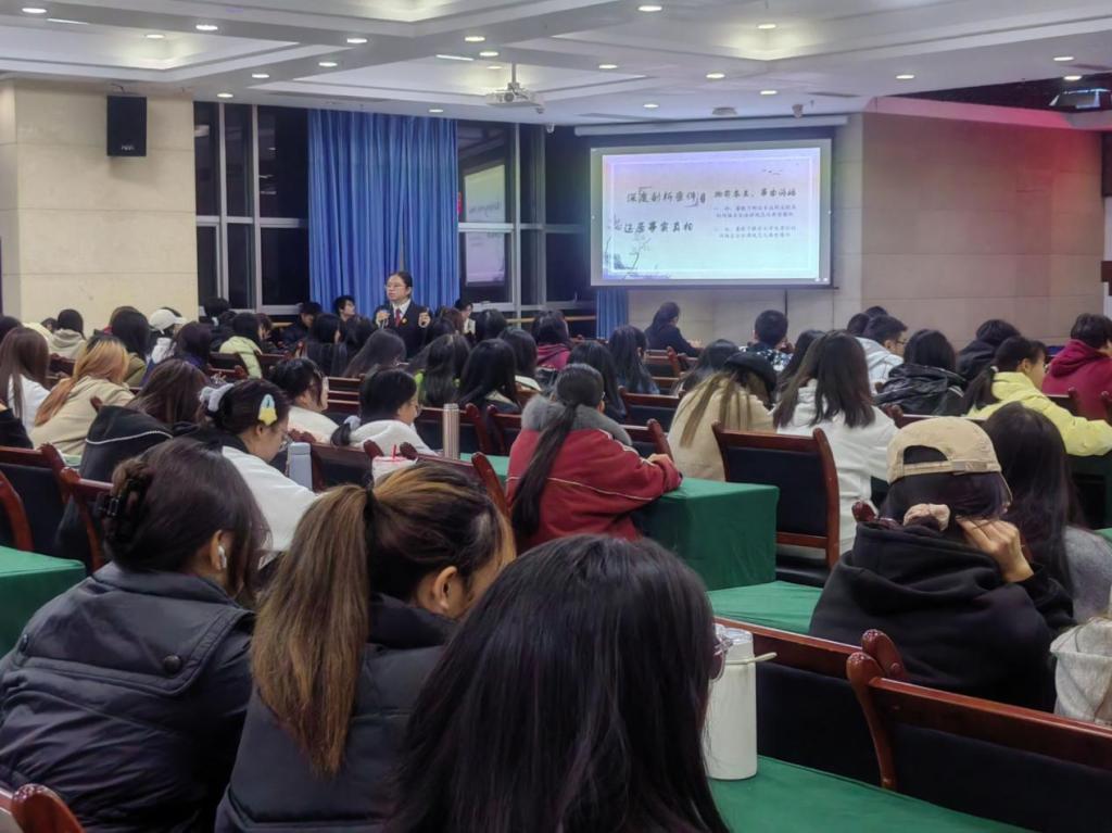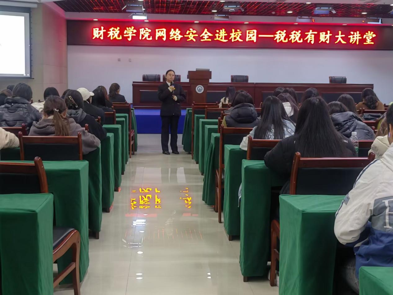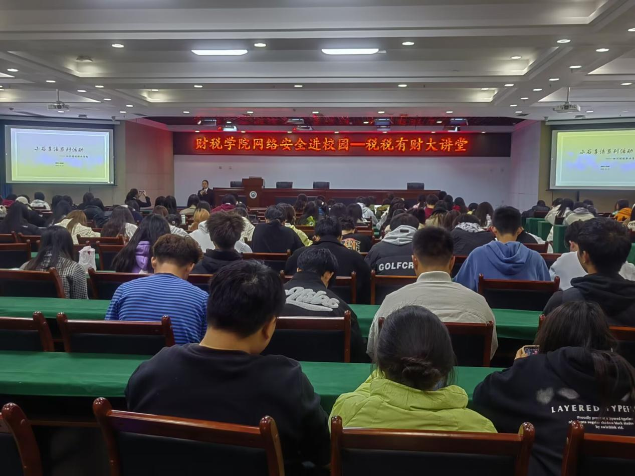 为深入贯彻落实习近平总书记关于网络强国的重要思想和习近平总书记关于网络安全工作“四个坚持”重要指示。2023年11月21日晚,7790cnm必发集团财税学院邀请简阳市人民法院的法官胡丽群为财税学子开展以“法护星芒 聚亮成光”为主题,采用“小石享法系列活动”模式的专题讲座,本次讲座针对社会热点问题,面向全院师生,宣传法律法规,普及知识技能,有效发动全校共筑网络安全防线。财税学院党总支副书记陈露、法律教研室主任戴娜娜、法律教研室教师李早早以及财税学院大一、大二各班学生代表参与。