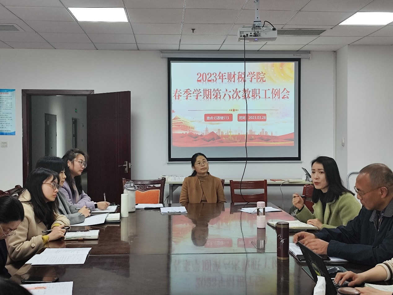 2023年3月28日下午,财税学院在行政楼512会议室召开第六次教职工大会。会议主题为强化课程建设、通报督导工作;安排和通报学工工作、技能大赛情况。会议由财税学院副院长祝刚主持并讲话,副院长罗艾、党总支副书记陈露发言,财税学院全体教职工参与会议。