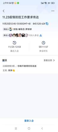 11月龙泉驿区疫情防控工作虽取得积极进展,但全区疫情形势依然复杂严峻,传播风险较大。为进一步守牢校园疫情防控底线,财税学院严格落实线上教育,开展了疫情防控警示主题班会,由辅导员主持主讲,2022级5个班共计275名学生参与。