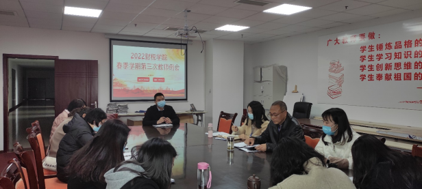为严格落实疫情防控措施,保障疫情期间线上教学质量,提升学院内部控制管理能力,高质量办好校友及校史修订工作,2022年2月22日下午,财税学院全体教职工在行政楼512会议室召开本年第三次教职工例会。会议由祝刚院长主持并作工作布置,陈露书记就有关工作做安排,罗艾老师就疫情线上教学做发言。