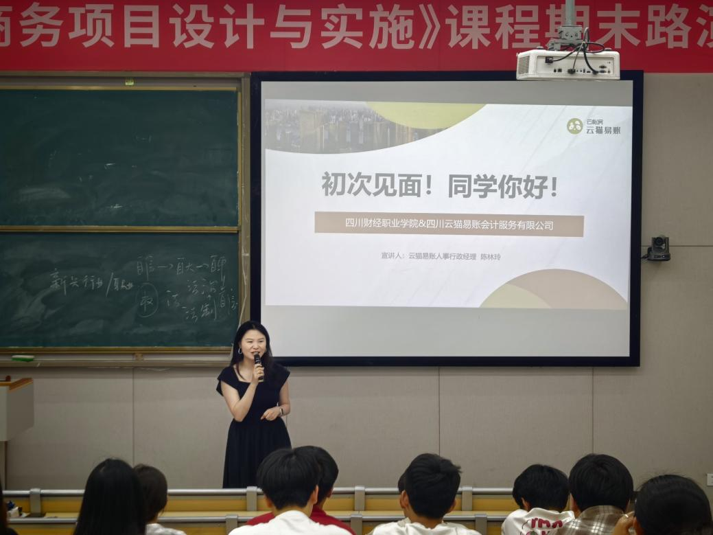 5月20日下午,四川云猫易账会计服务有限公司专场宣讲会在7790cnm必发集团教学楼B108举行。财税学院党总支书记陈露、副院长罗艾、财税大数据应用管理教研室蒋莉蘋、财政支出绩效管理教研室骨干教师任雪仙、专职辅导员邓岚、企业人事行政经理陈林玲及2023级财税大数据应用专业、财政支出绩效管理专业全体学生参会。