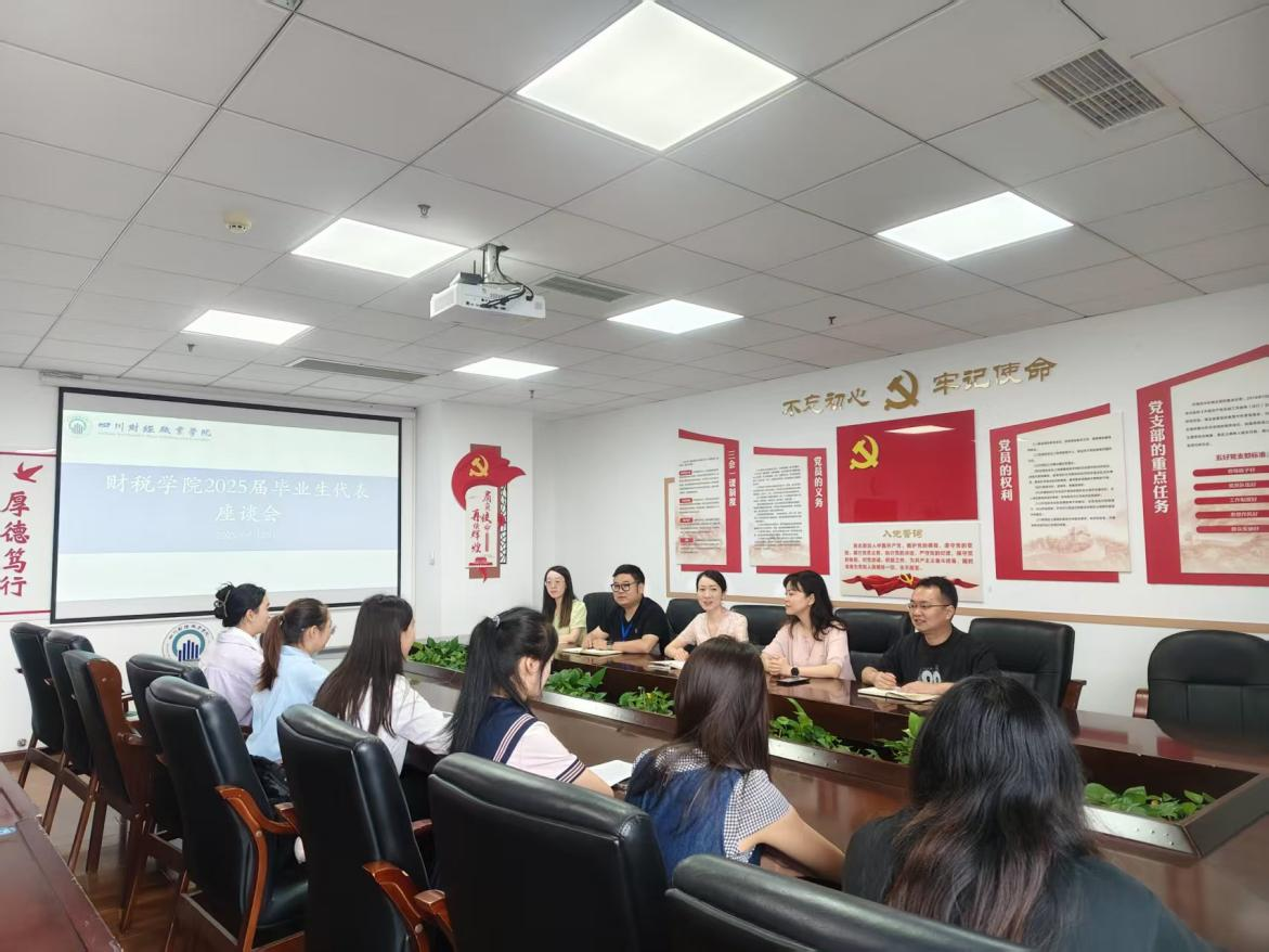 2025年6月25日,财税学院于明德楼512会议室召开“2025届毕业生代表座谈会”。本次座谈会旨在深入了解毕业生的学习、生活和就业情况,倾听学生心声,为学院进一步优化教育教学和学生管理工作提供参考。财税学院党总支书记陈露、副院长罗艾、辅导员代表、优秀毕业生代表及大一大二学生代表出席本次座谈会。