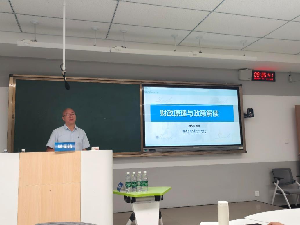 首场讲座聚焦“财政原理与政策解读”,由西南财经大学财政税务学院教授、博士生导师周克清主讲。周克清教授作为国家级一流本科专业建设点负责人、国家级课程思政教学名师、国家级一流本科课程负责人,并兼任中国财政学会理事,在财税理论与实践、地方税收与税制结构、政府会计等领域造诣深厚。他出版著作四部,主持或主研国家级、省部级项目十余项,在CSSCI期刊发表论文三十余篇,成果丰硕且多次获奖。