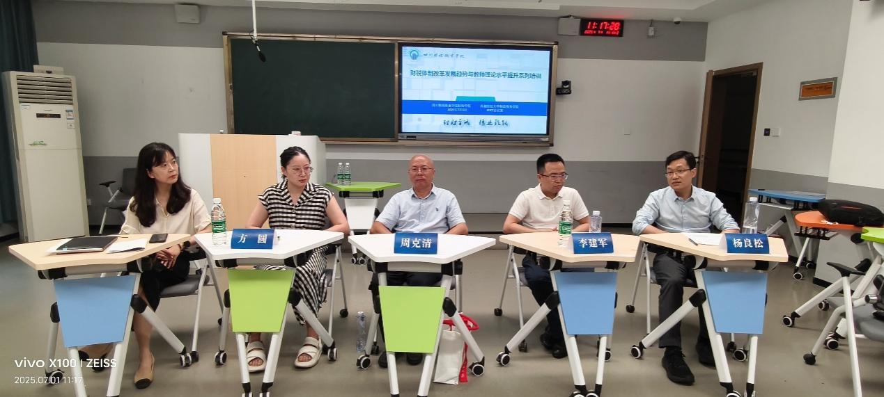 系列讲座结束后,学院组织了专题研讨。与会教师围绕讲座核心内容,就如何将最新财税改革动态与前沿研究成果有机融入课堂教学、如何有效提升课程思政育人效果、如何应对数字化对财税专业教学提出的新挑战等关键议题展开了热烈而深入的讨论。周克清、杨良松、刘元生三位专家积极参与研讨,与教师们互动答疑,分享真知灼见。思想的火花在交流中不断碰撞,有效促进了教学理念的更新和育人共识的凝聚。