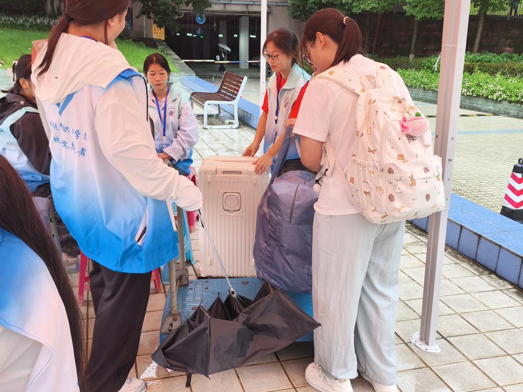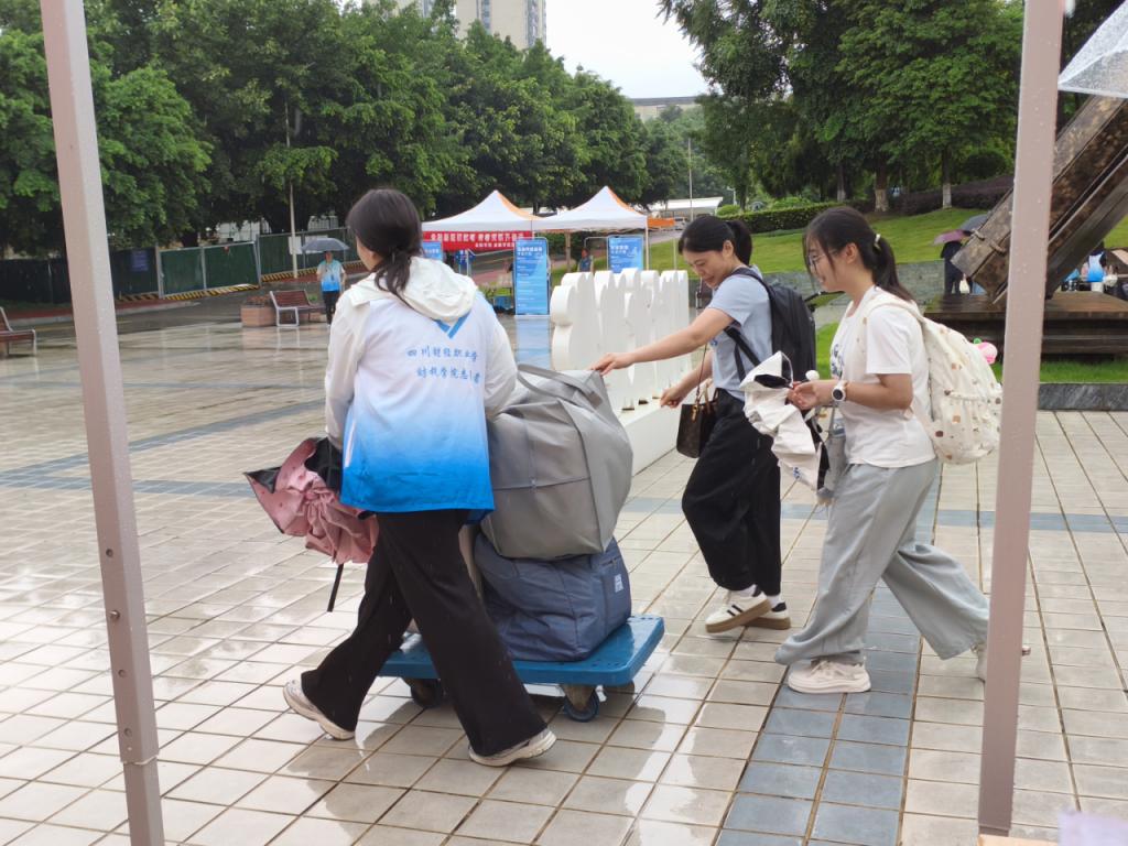 前门、后门、图书馆的志愿服务点,早已被亮眼的“志愿红”点亮。财税学院的志愿者们撑着伞早早到位,见新生拖着行李在雨中驻足,立刻快步上前接过行囊,一边撑伞引路,一边轻声讲解报到流程;面对“宿舍离这儿远吗”“材料忘带怎么办”的焦急询问,他们始终笑着耐心回应,雨水打湿了肩头,却没凉透眼底的热情。一句“跟我来,别淋着”,成了新生初入校园最安心的依靠。